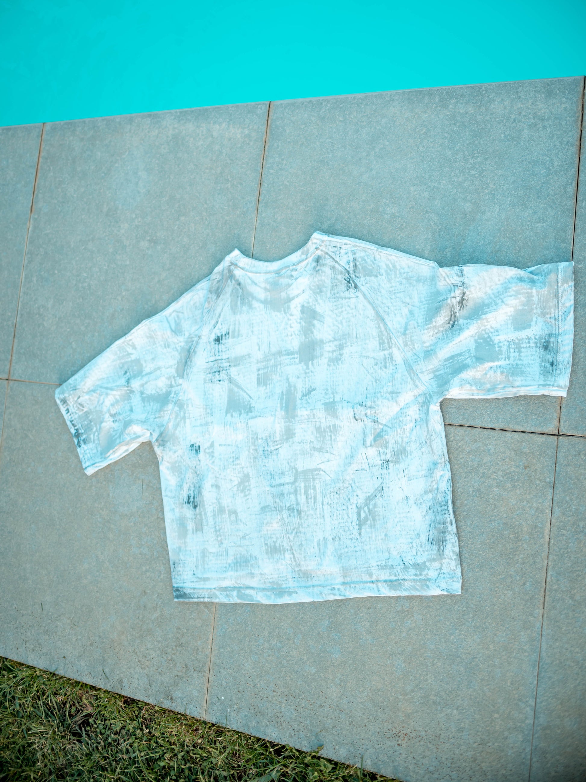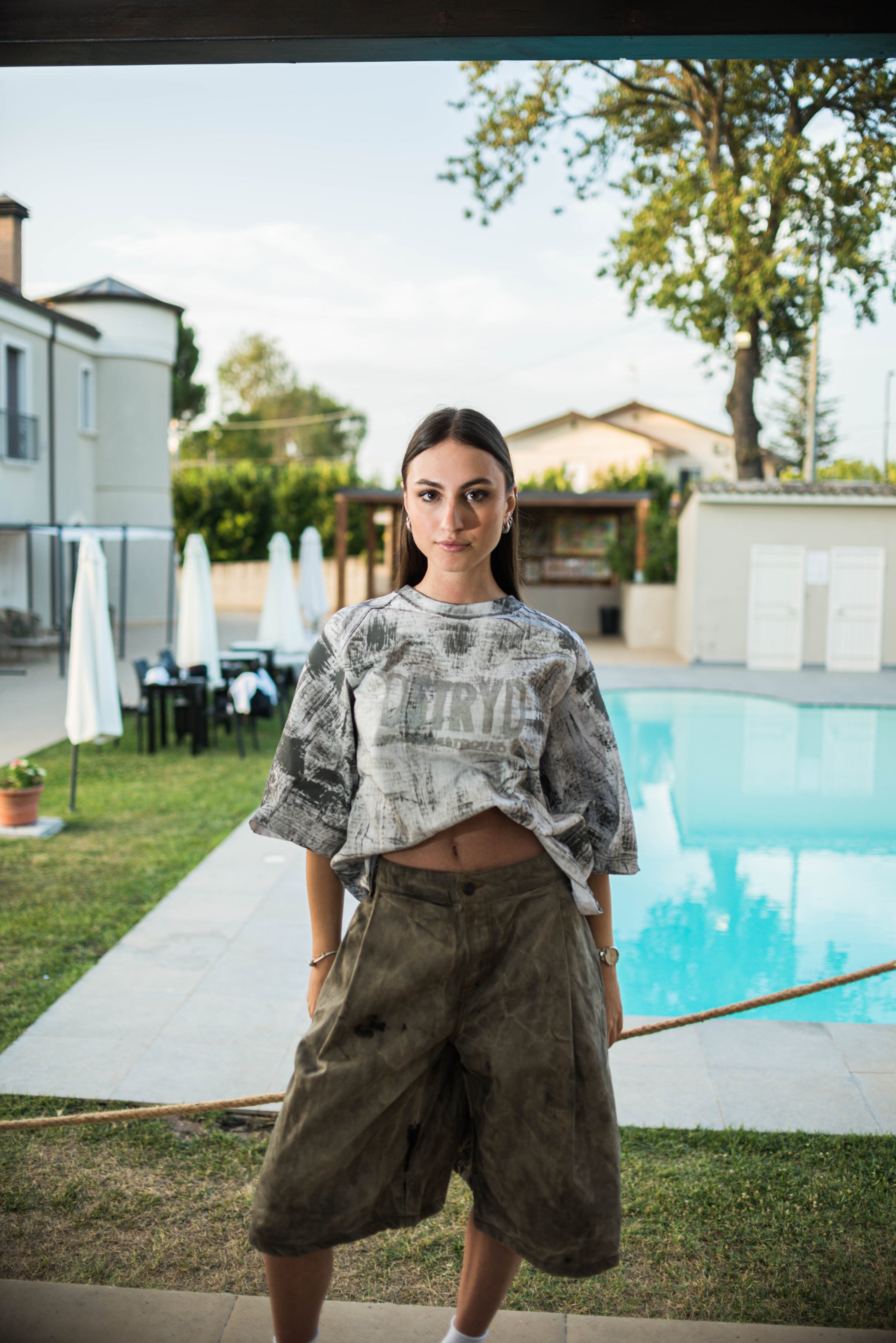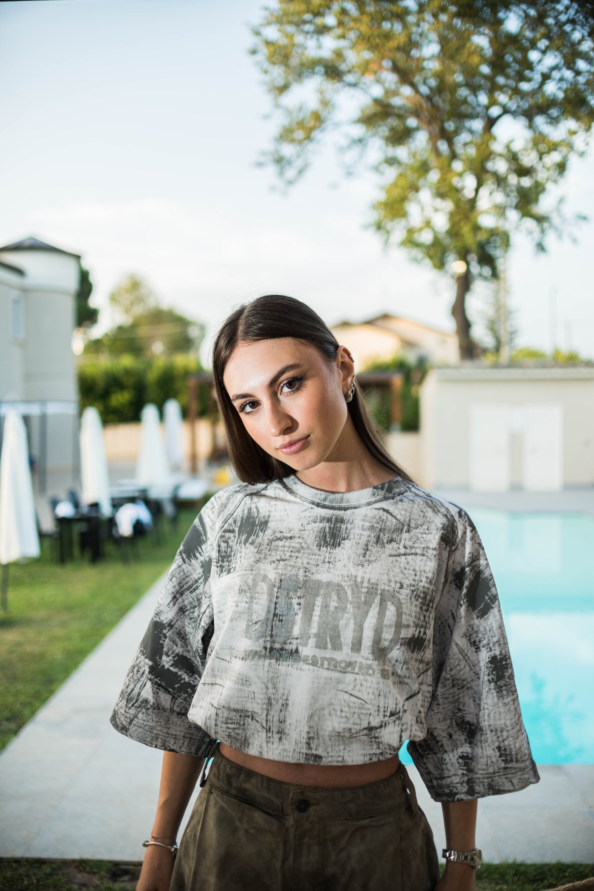 TEE crop fit, con manica Raglan, customizzata a mano tramite spazzolate di vernice su tutta la maglia e logo sul davanti disegnato e pitturato a mano.