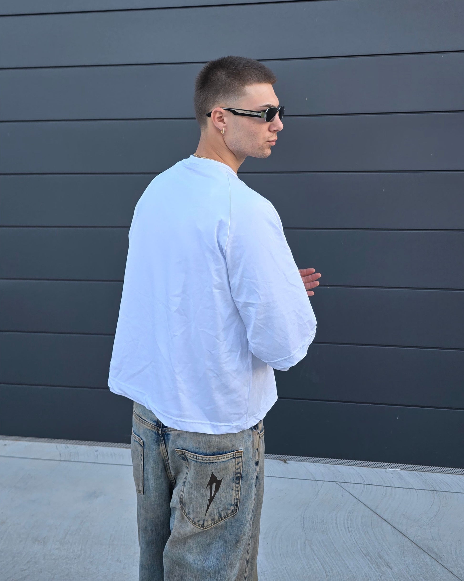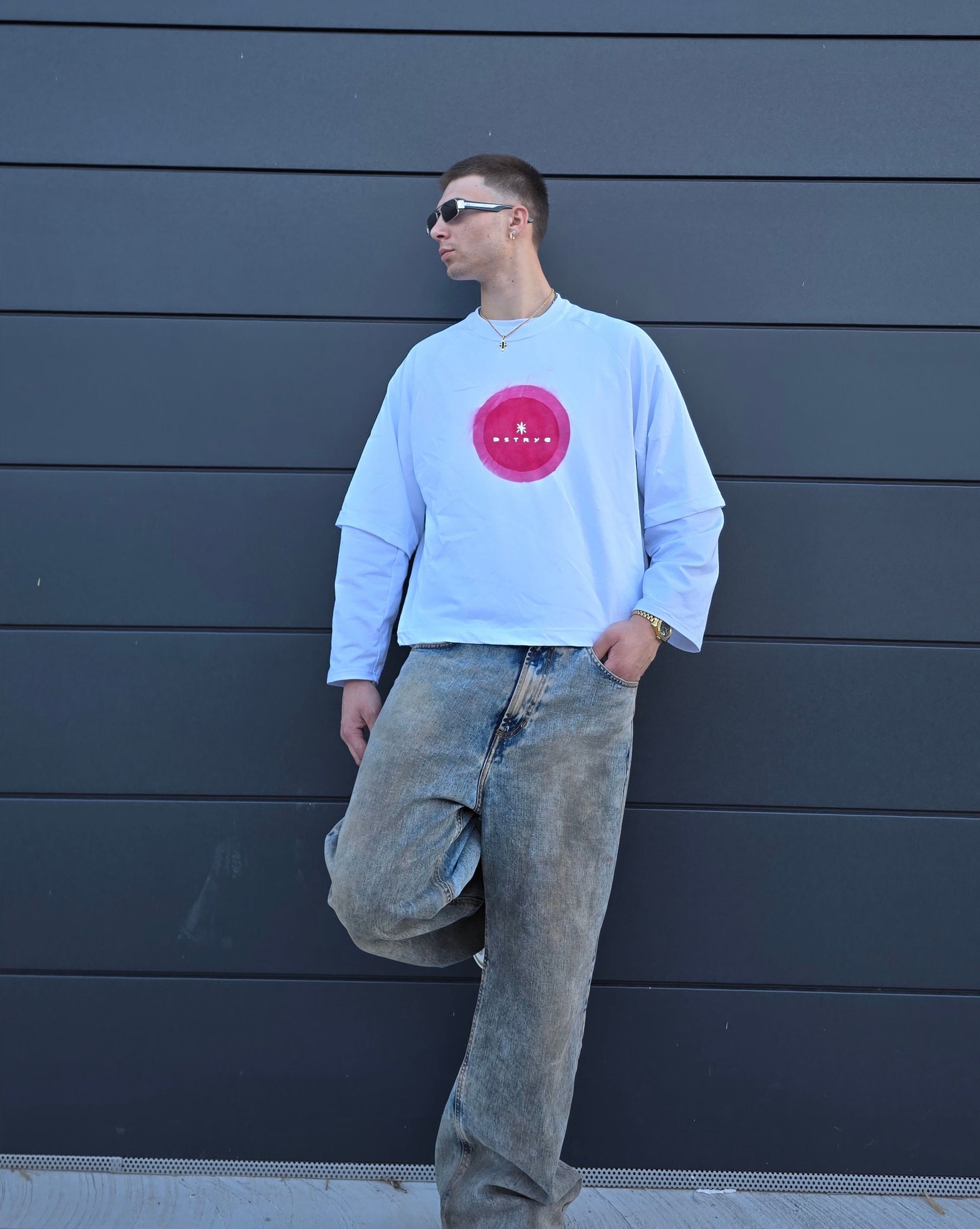 Tee in 100% cotone, Made in italy, con taglio raglan e fit cropped. La tee è customizzata a mano con la realizzazione di due cerchi aerografati al centro, e all'interno il logo con effetto bubble 3D.