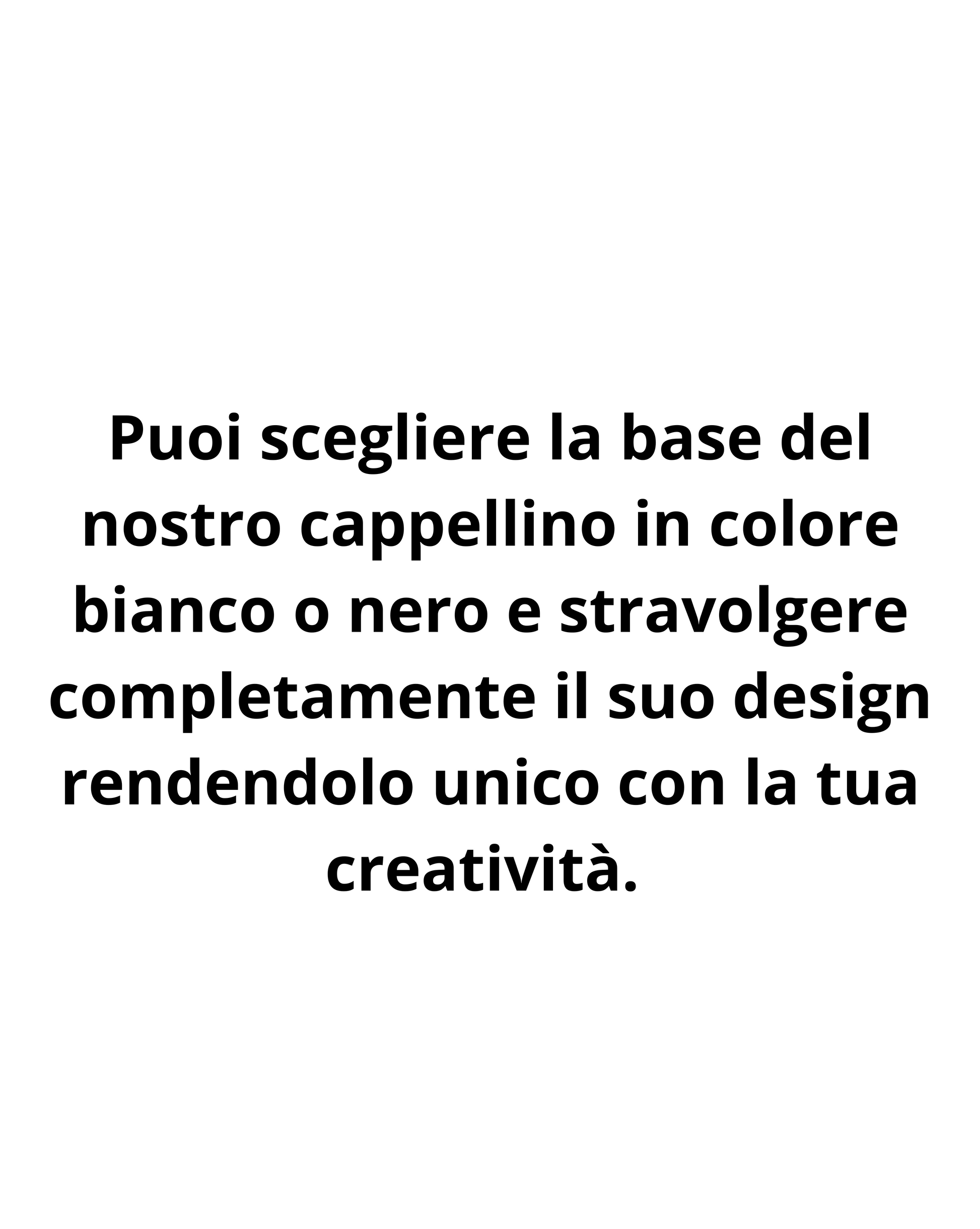 Realizzeremo il cappellino con il design scelto da te, effettua l'ordine e poi contattaci su instagram, dove ci spiegherai il tuo design e insieme lo realizzeremo. Partiremo dalla base del nostro cappellino standard in colorazione bianca o nera e stravolgeremo il design a tuo piacimento.