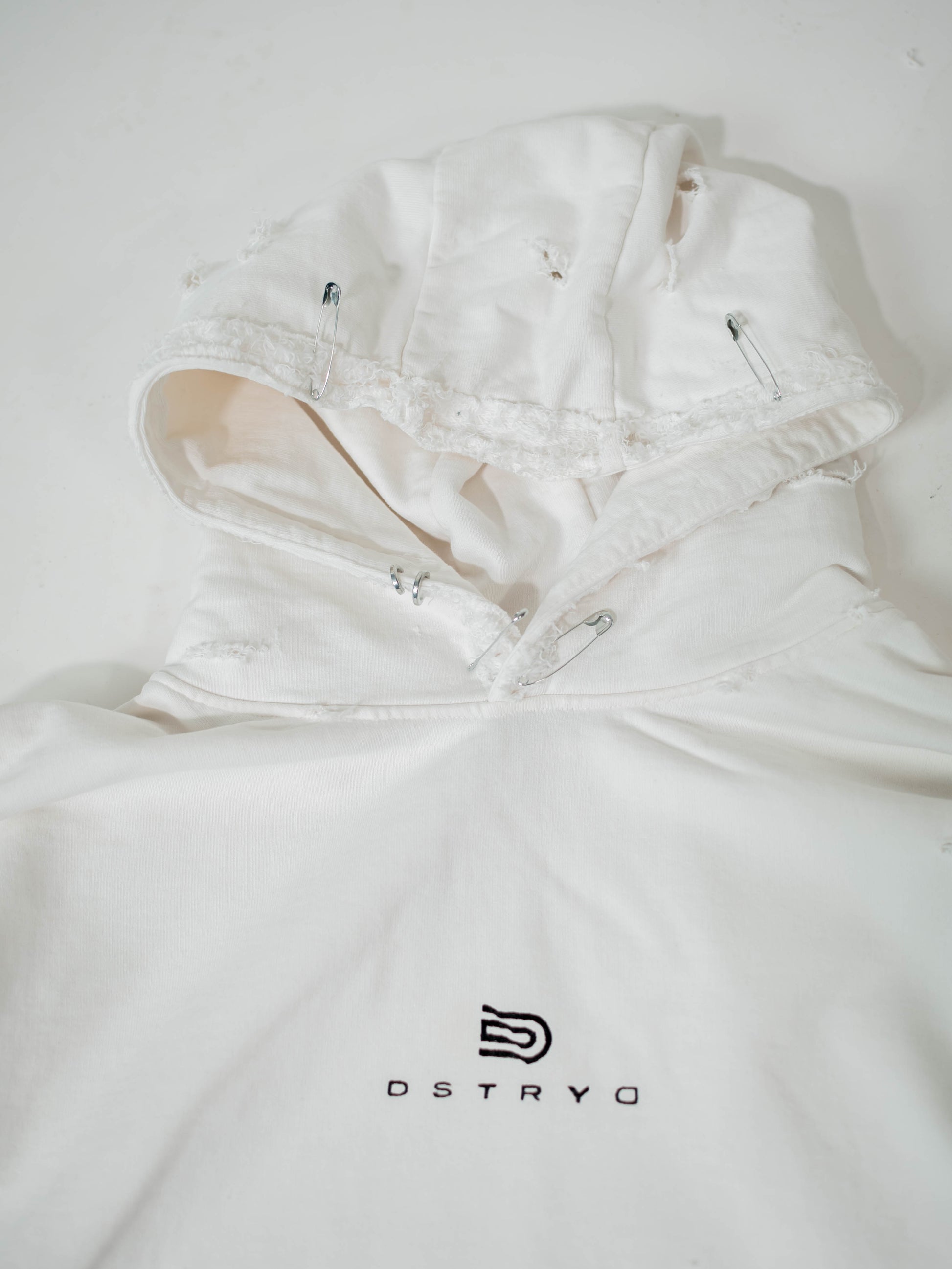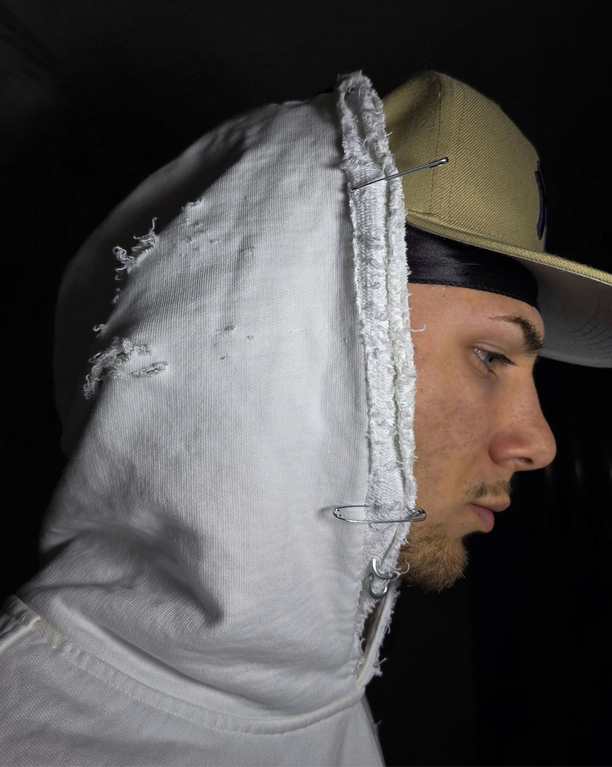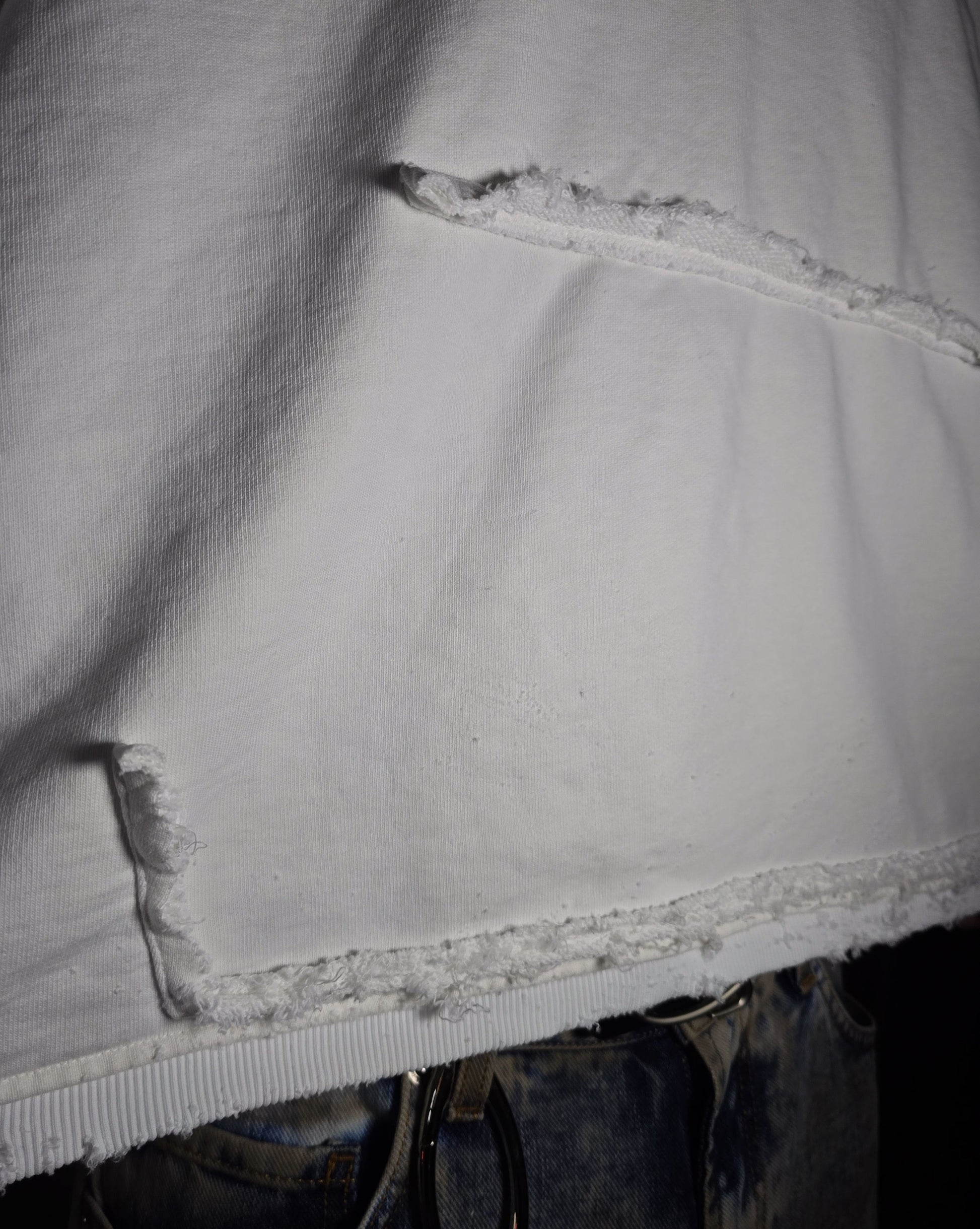 HOODIE rectangular fit, customizzata a mano,con sfrangiature, rimozione tasca, pittura per tessuti,l ed anelli e spille sul cappuccio ,realizzata dai nostri artigiani italiani ,100%cotone grammatura pesante peso effettivo 1KG