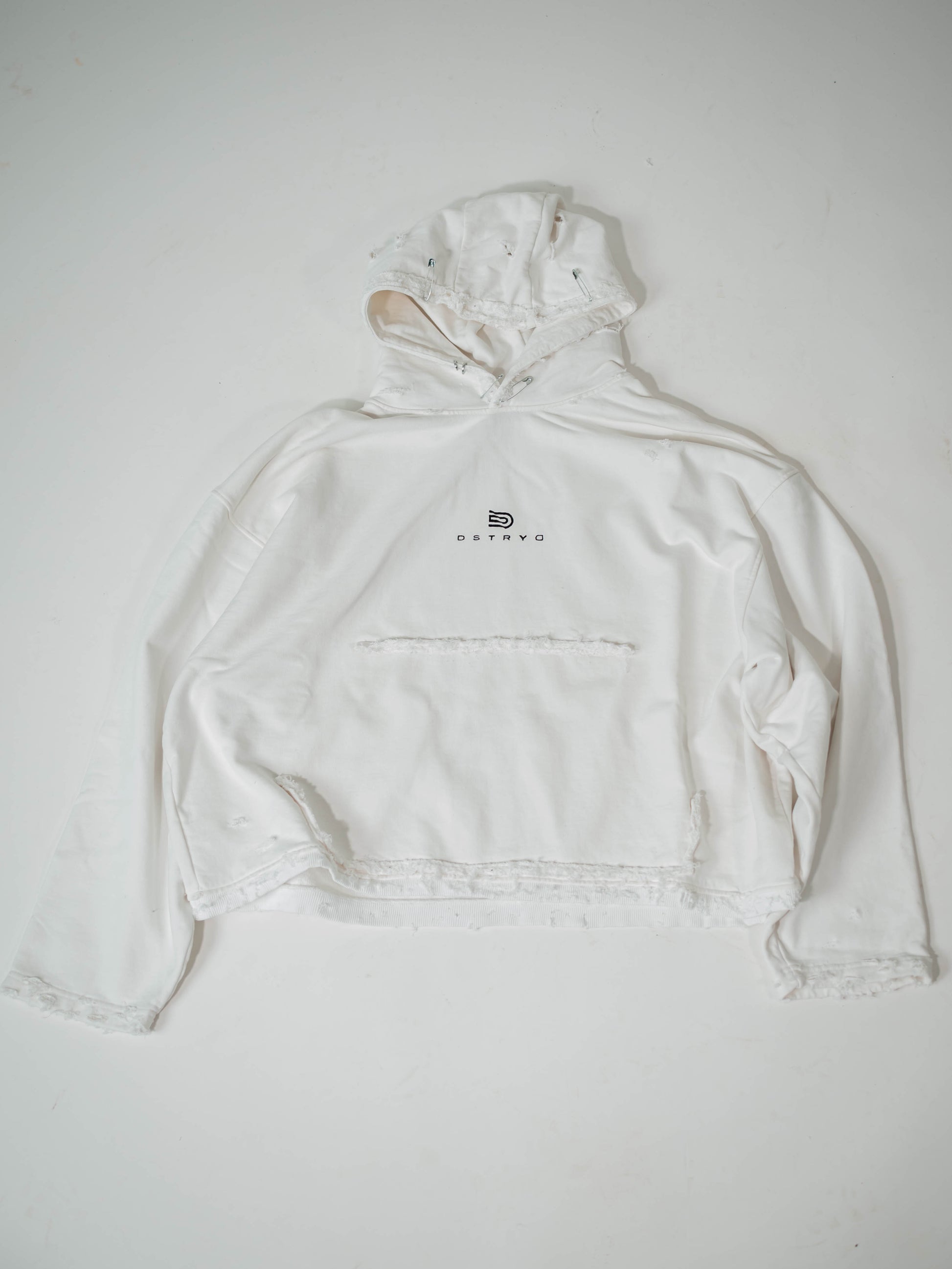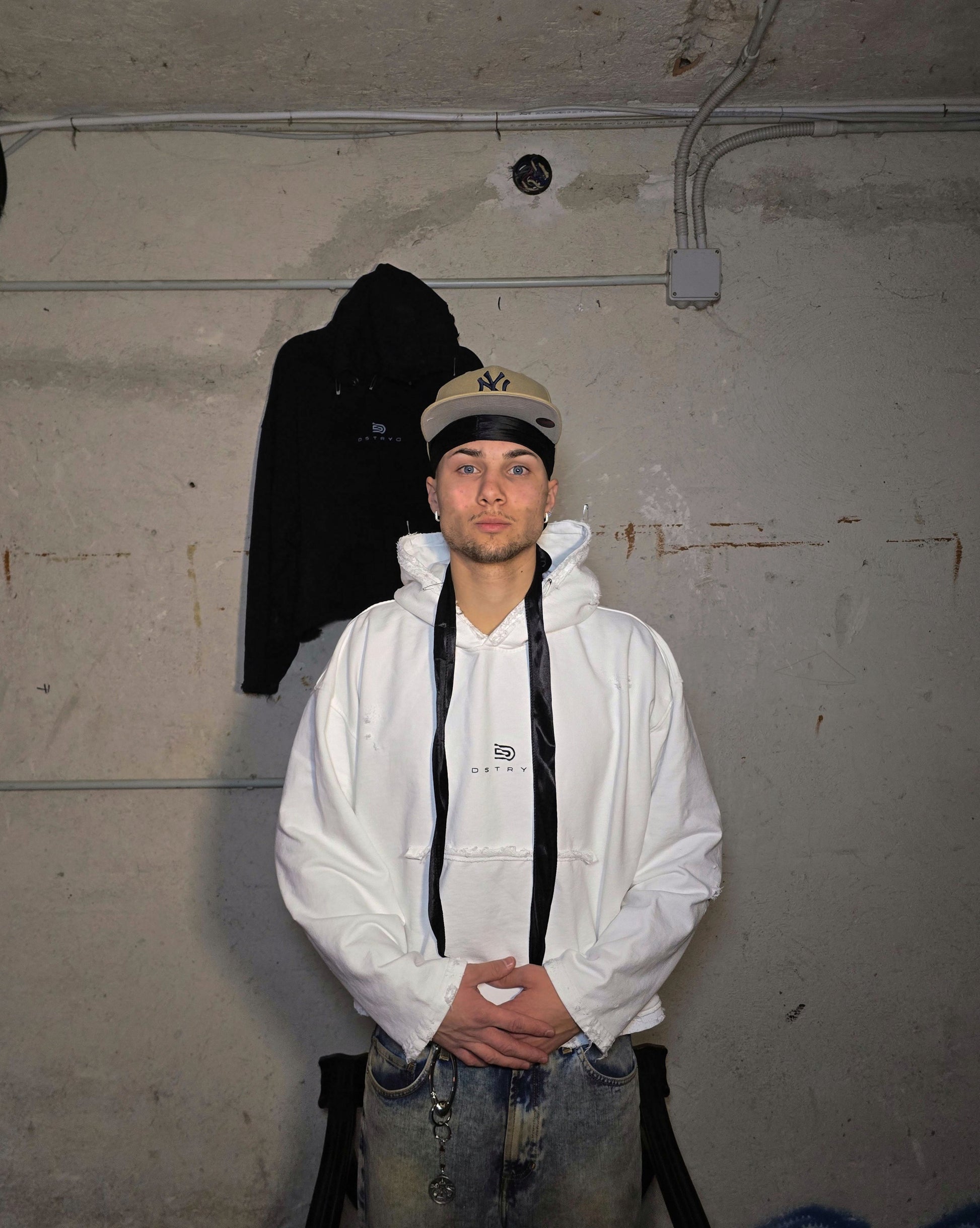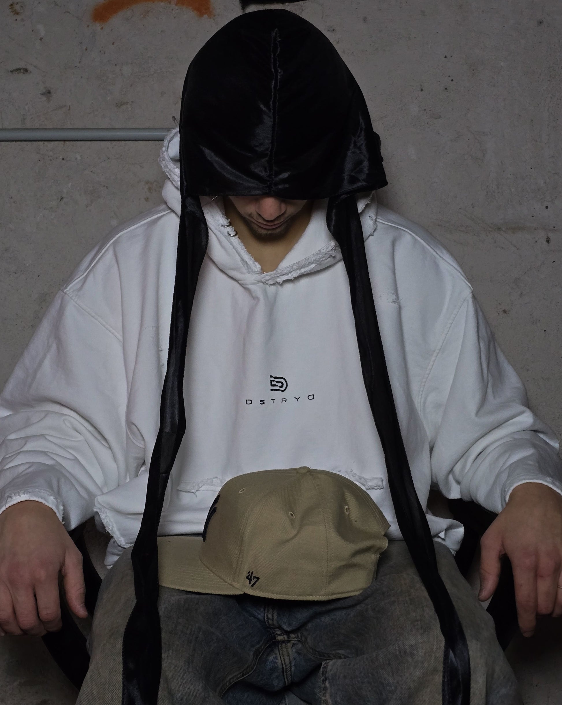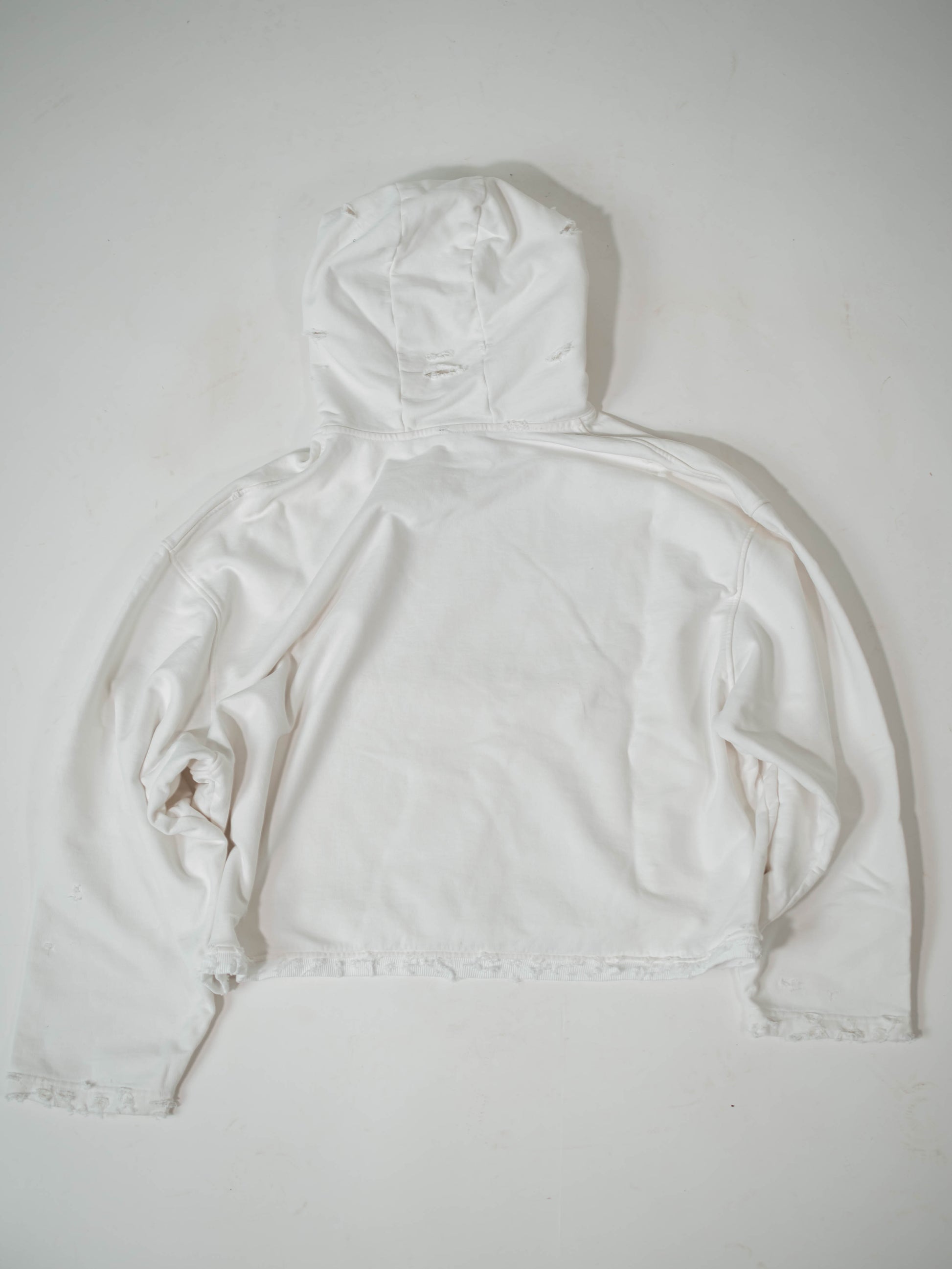 HOODIE rectangular fit, customizzata a mano,con sfrangiature, rimozione tasca, pittura per tessuti,l ed anelli e spille sul cappuccio ,realizzata dai nostri artigiani italiani ,100%cotone grammatura pesante peso effettivo 1KG