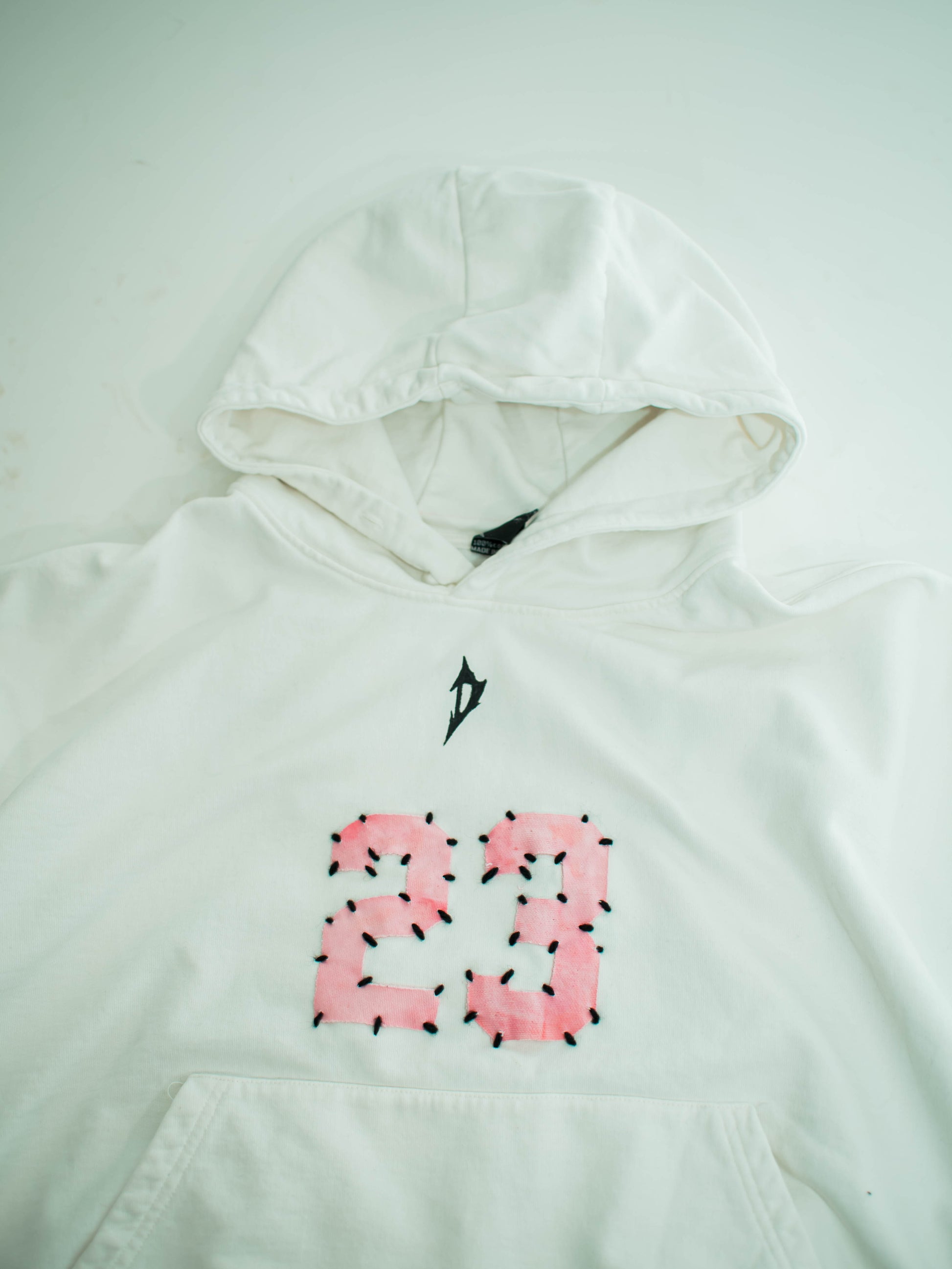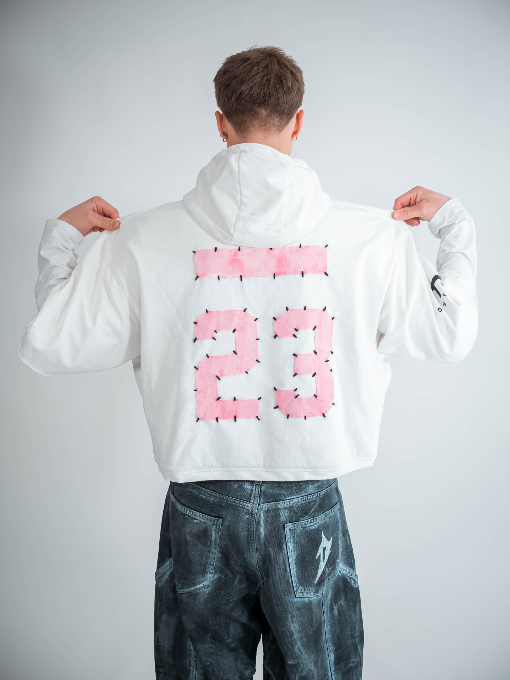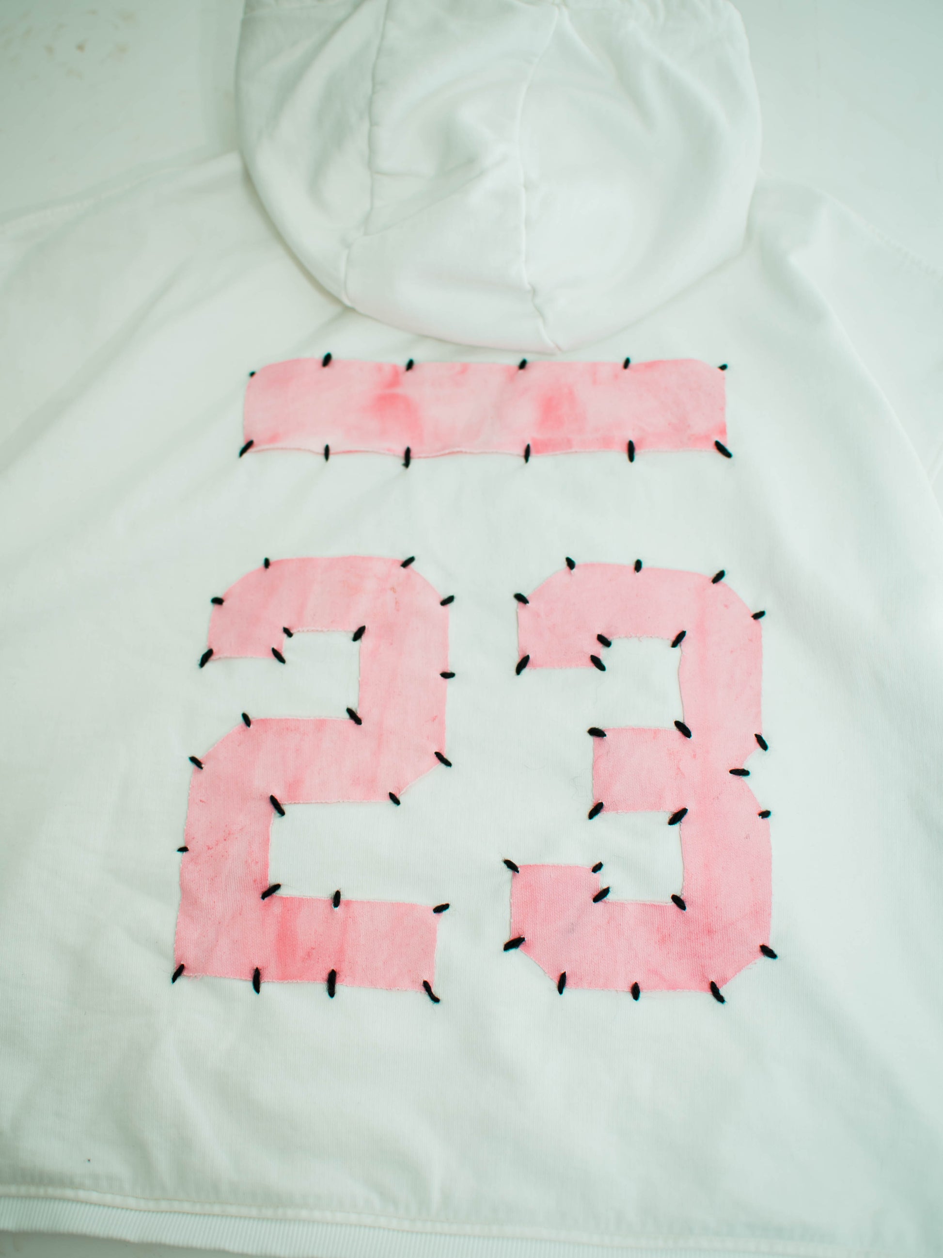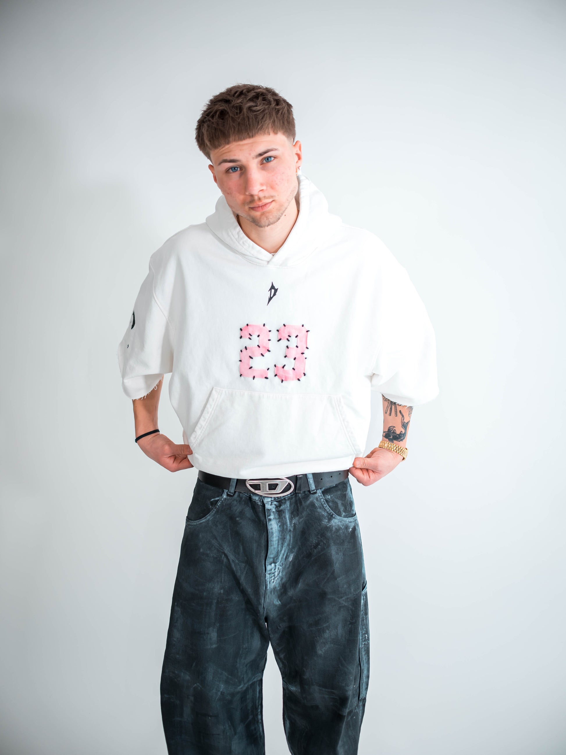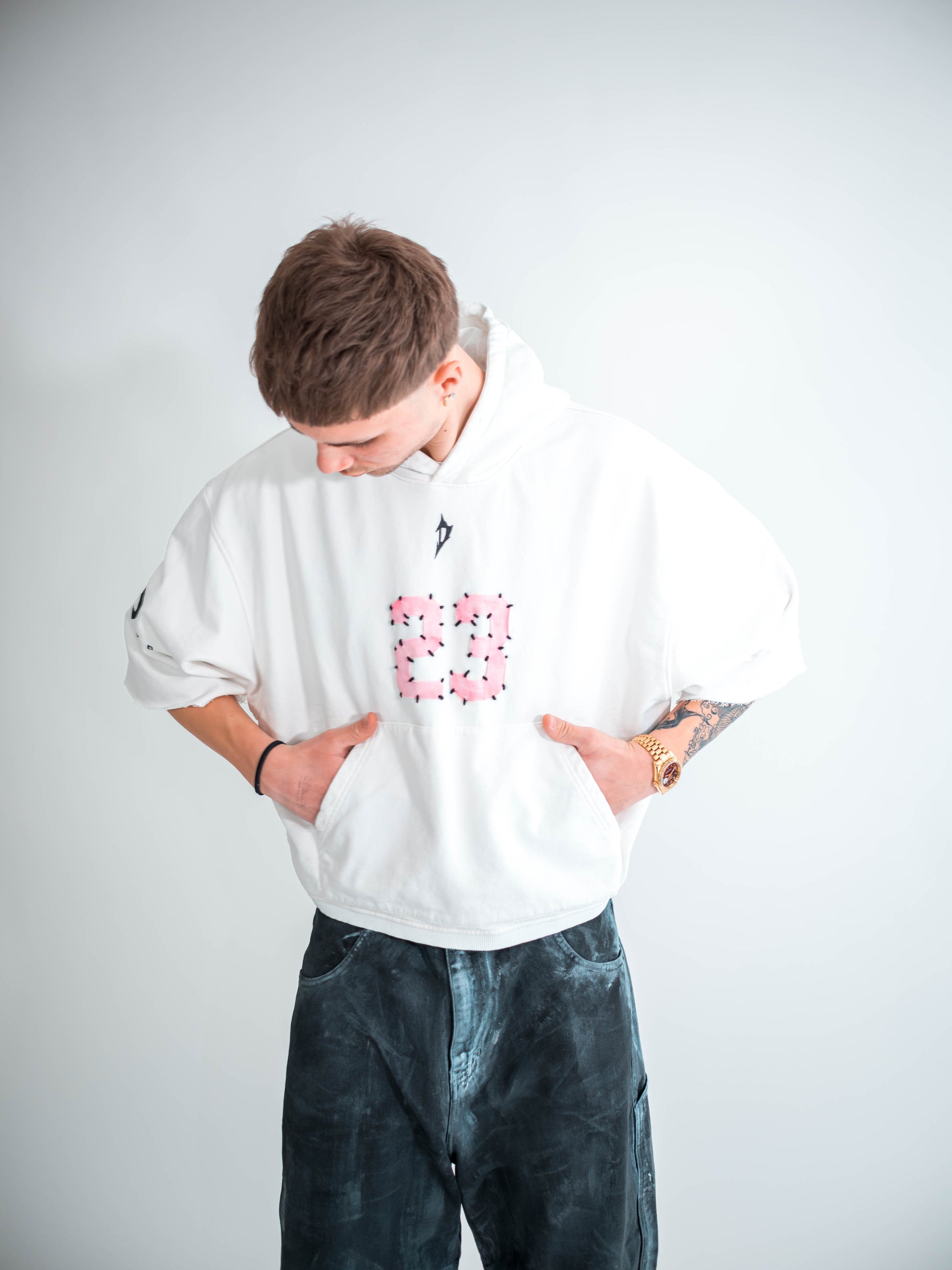Hoodie rectangular fit, 100% cotone made in italy. Felpa customizzata con maniche tagliate, vengono ritagliate e cuciete a mano i numeri scelti dal cliente, dettagli e nome pitturato a mano. Peso effettivo hoodie 1kg