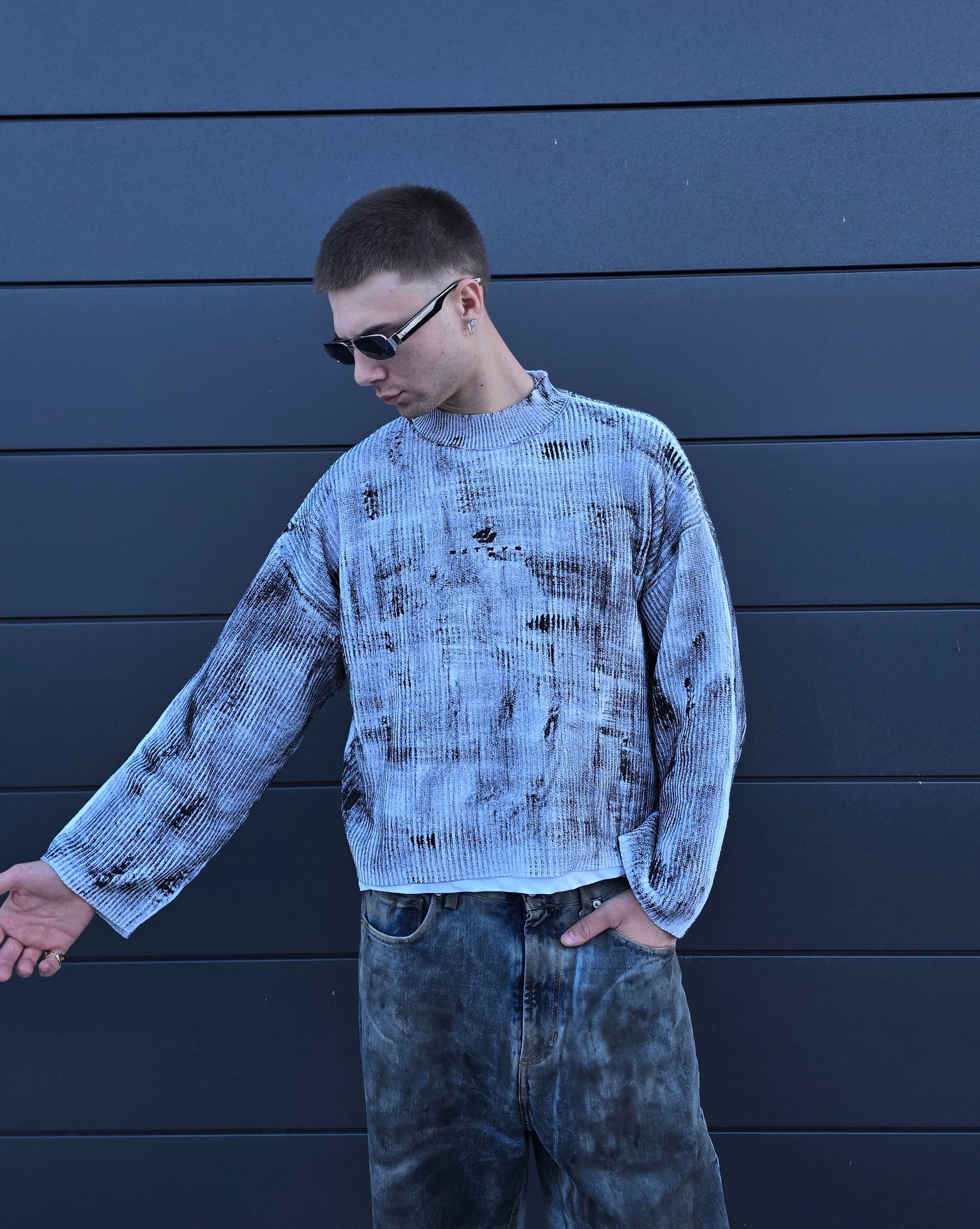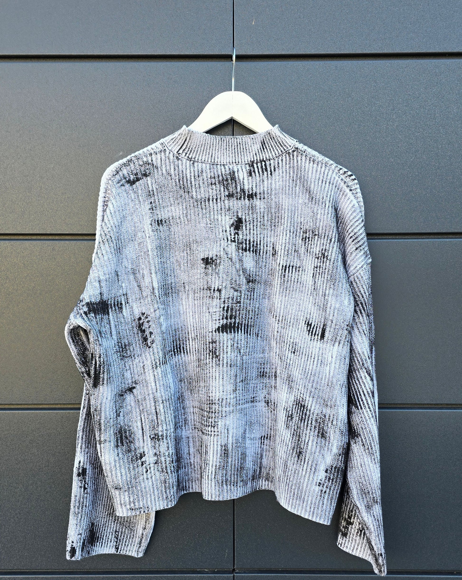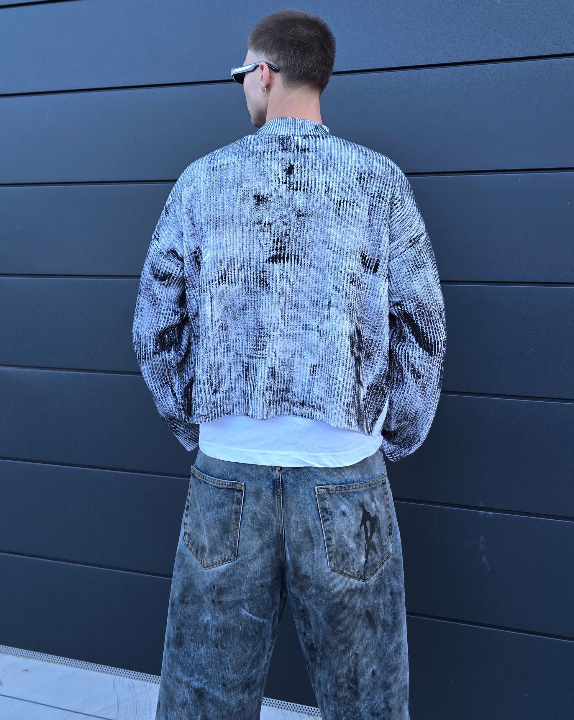 Maglione bianco a costine, 100% cotone Made in Italy. Fit cropped con colletto alto. Customizzato a mano con spennellature in vernice nera su tutto il maglione, logo sempre pitturato a mano sul davanti.