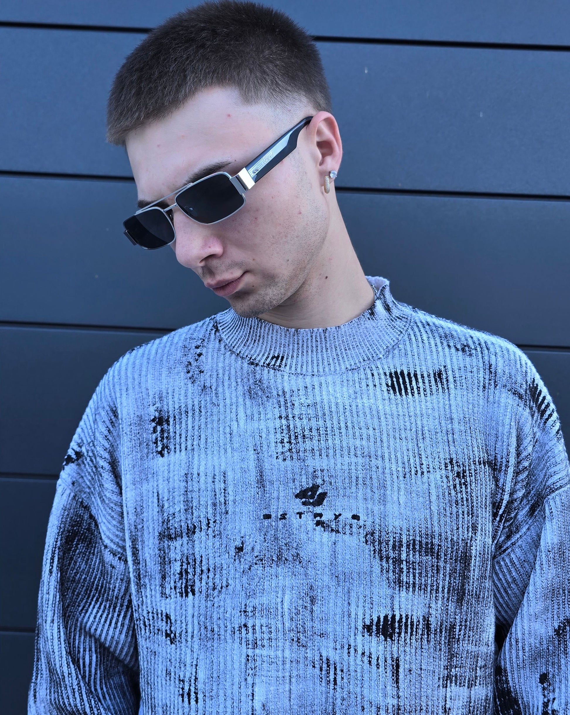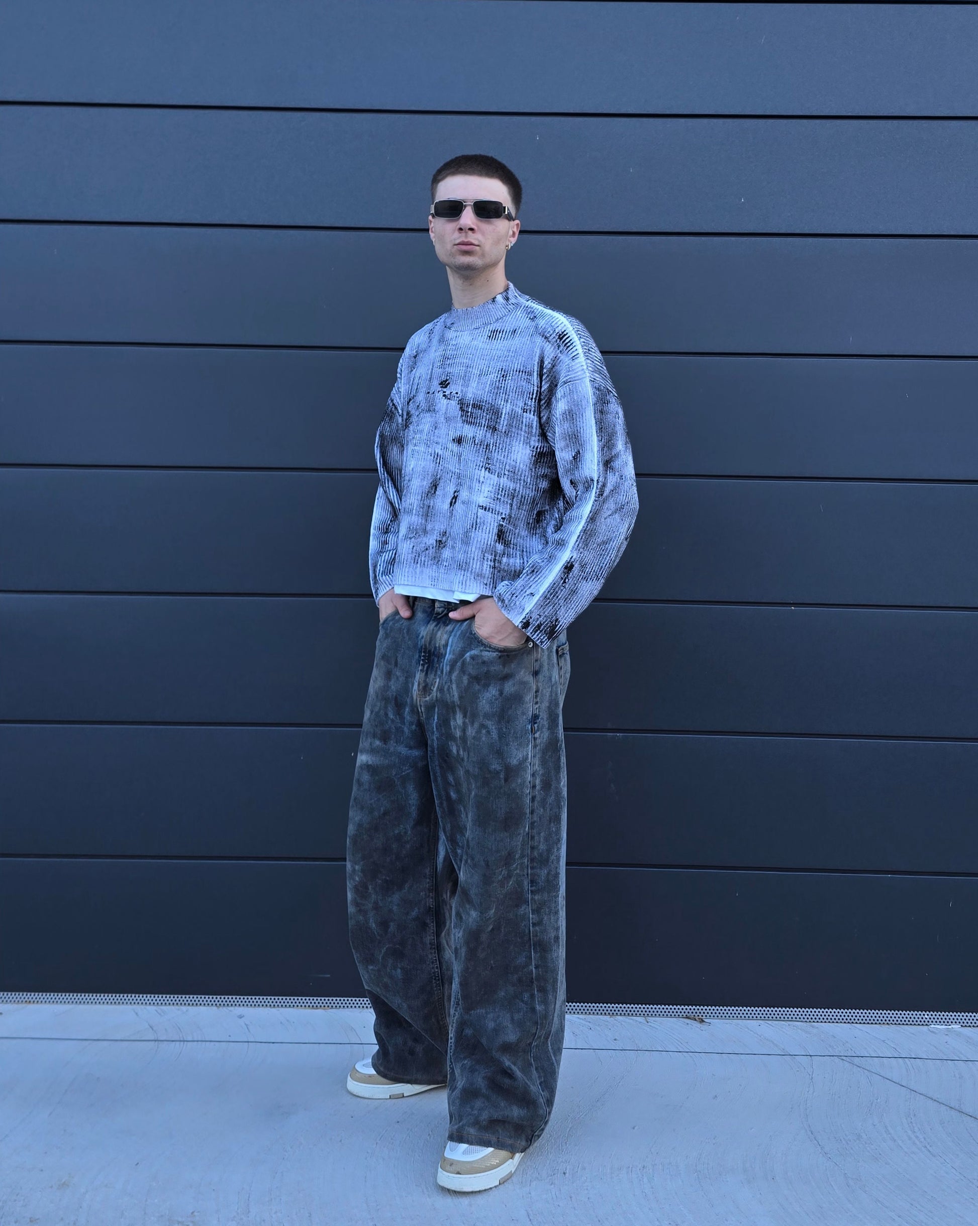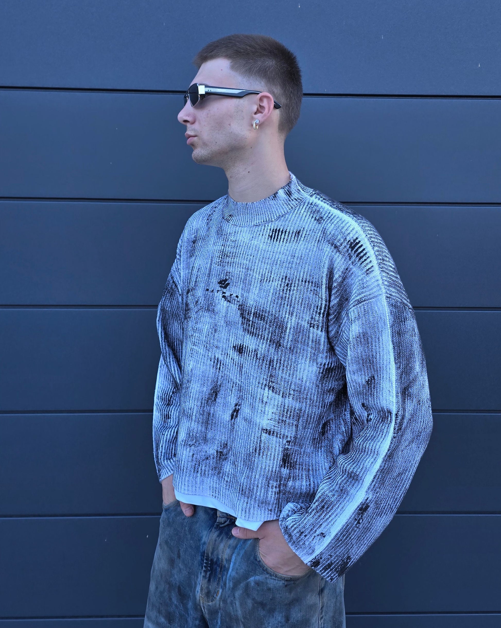 Maglione bianco a costine, 100% cotone Made in Italy. Fit cropped con colletto alto. Customizzato a mano con spennellature in vernice nera su tutto il maglione, logo sempre pitturato a mano sul davanti.
