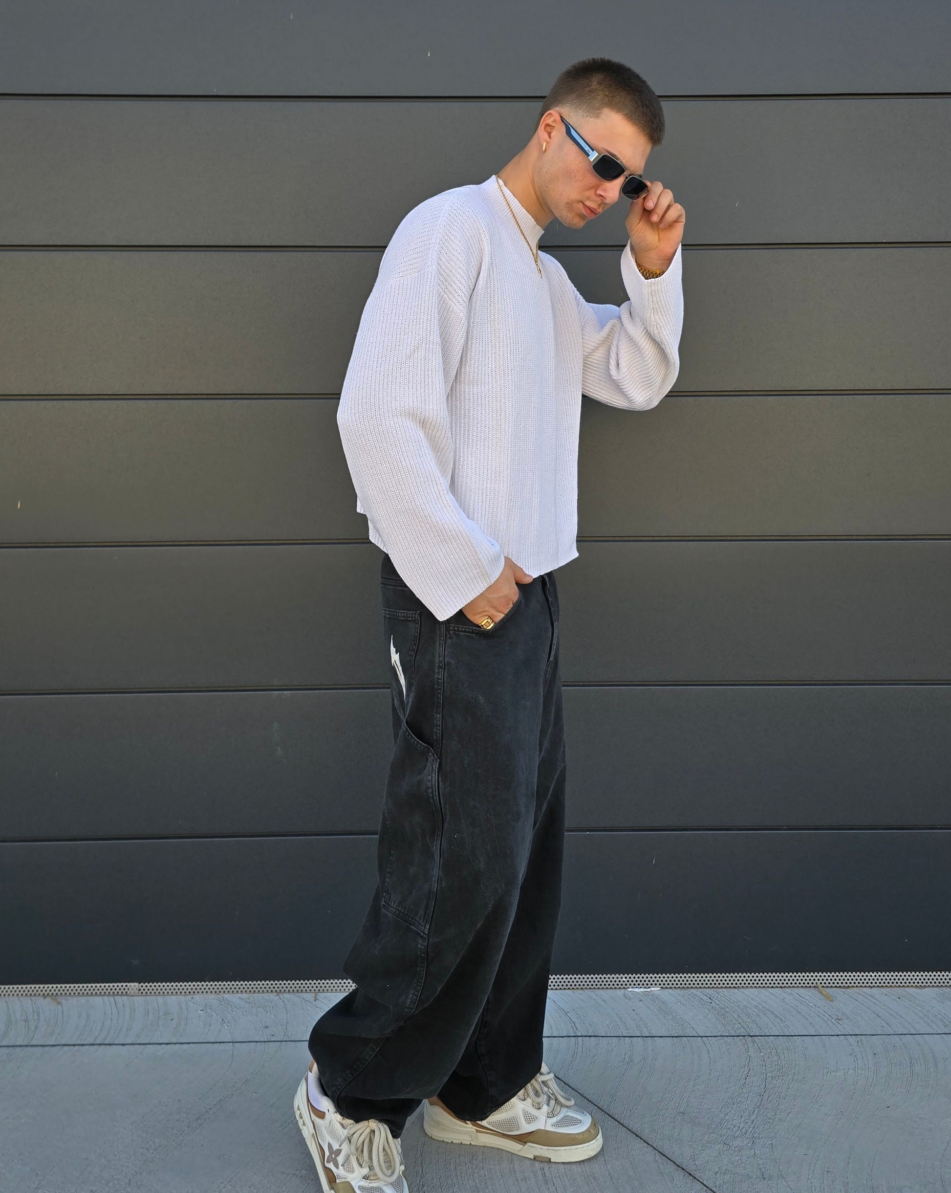 Maglione bianco a costine, 100% cotone Made in Italy. Fit cropped con colletto alto