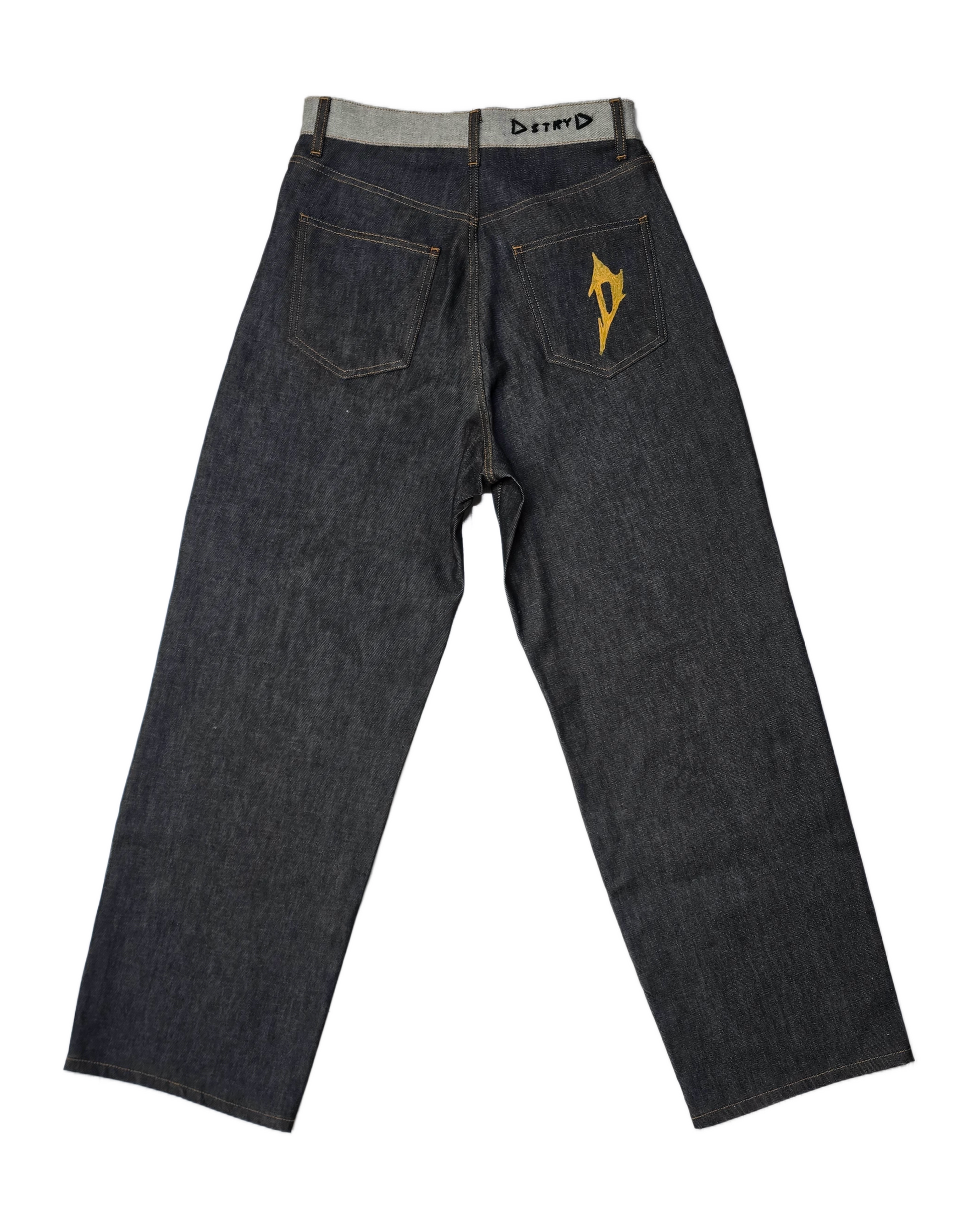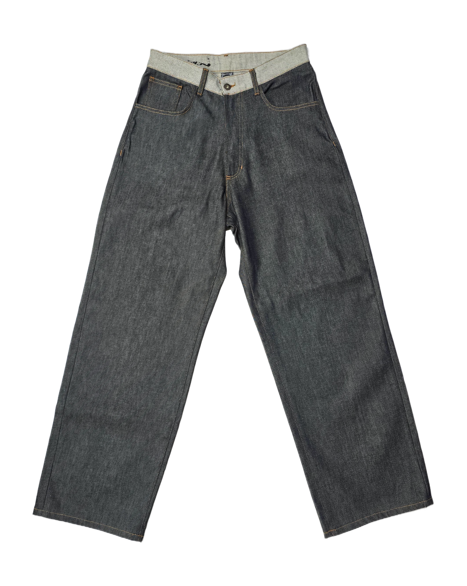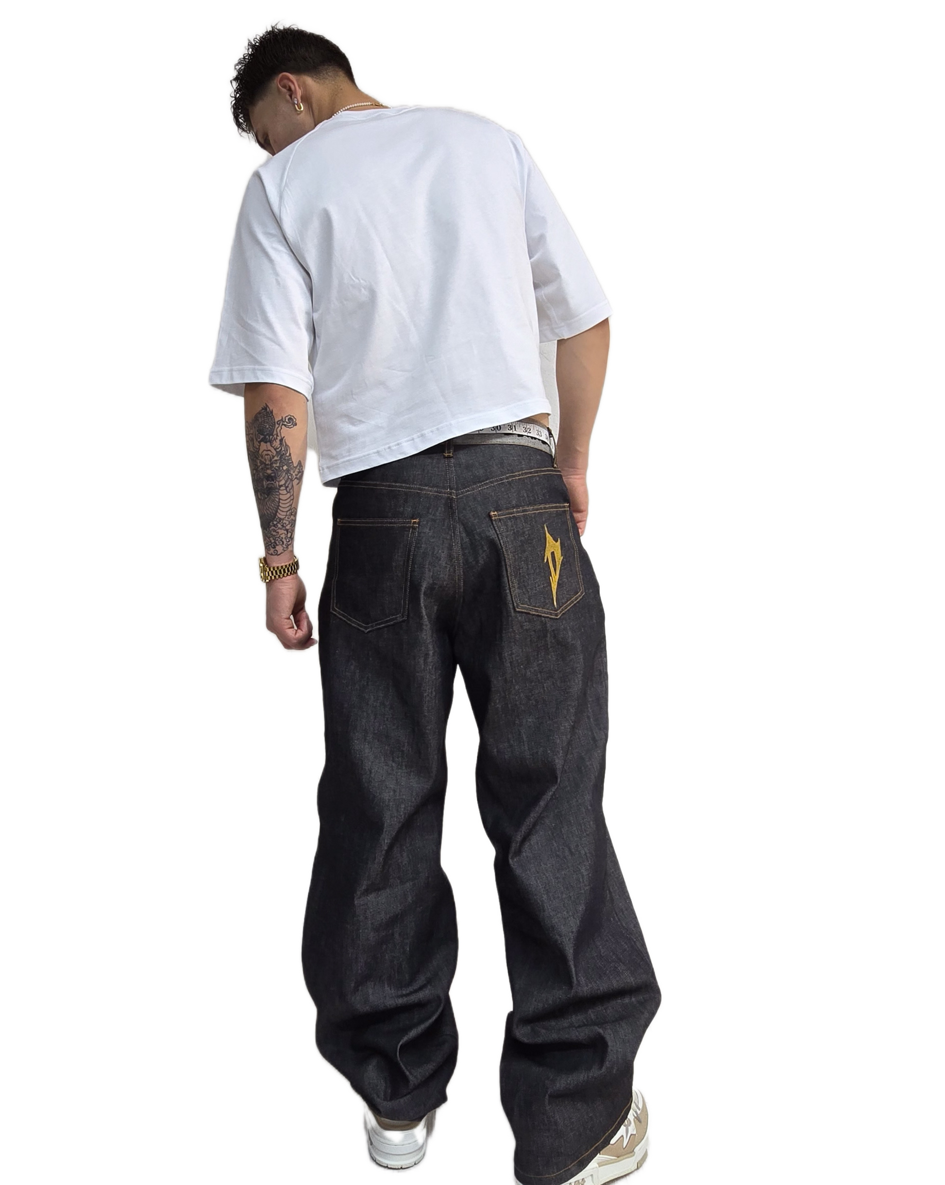 Raw denim in 100% cotone e made in italy, fit baggy con tessuto in denim di 14oz. Presenta un cinturino a contrasto realizzato con il rovescio del denim, sul dietro c'è una ricamatura fatta a mano e il nostro logo pitturato sulla tasca destra. Inoltre, nell'acquisto è incluso un metro da sarta da usare come accessorio del jeans.