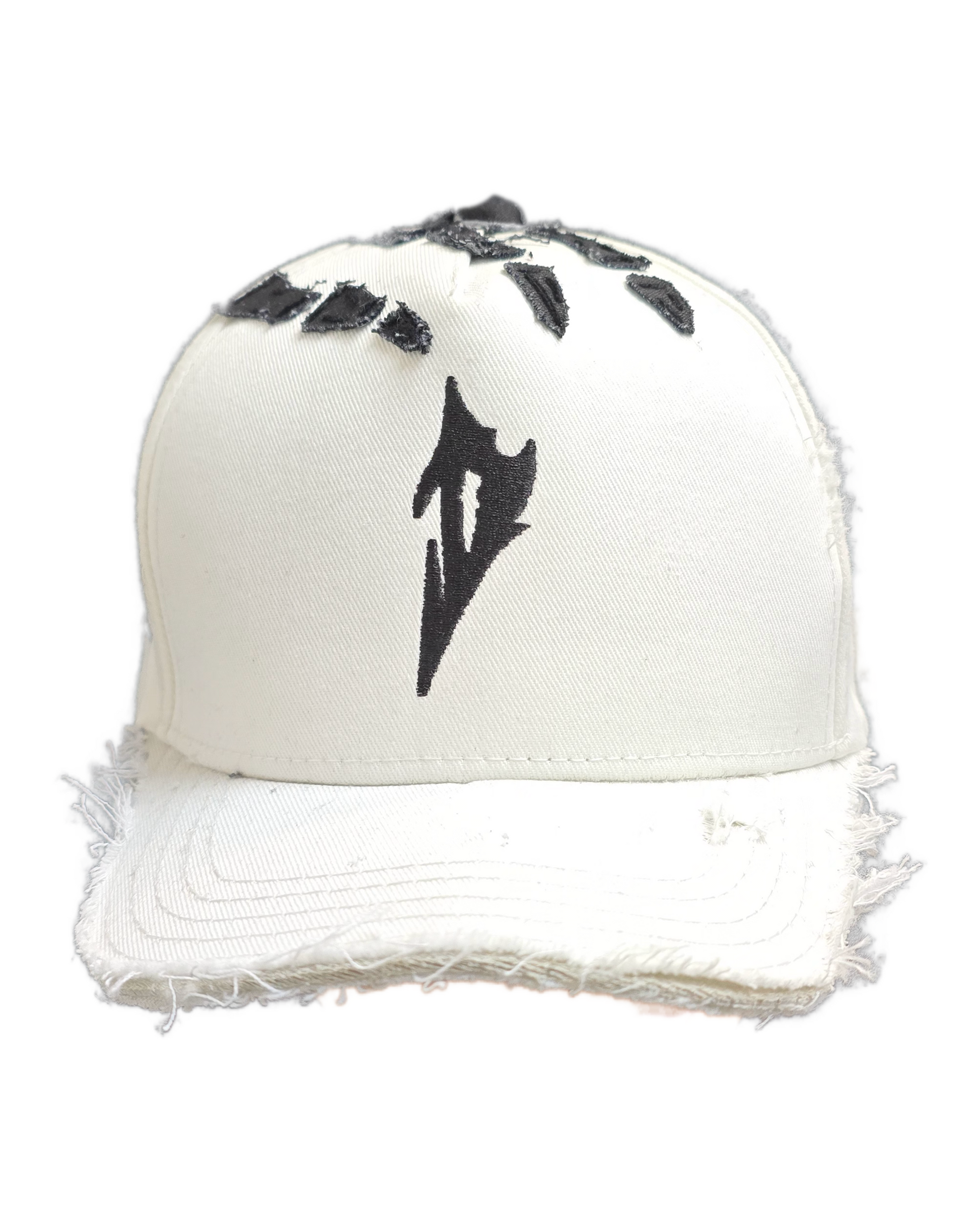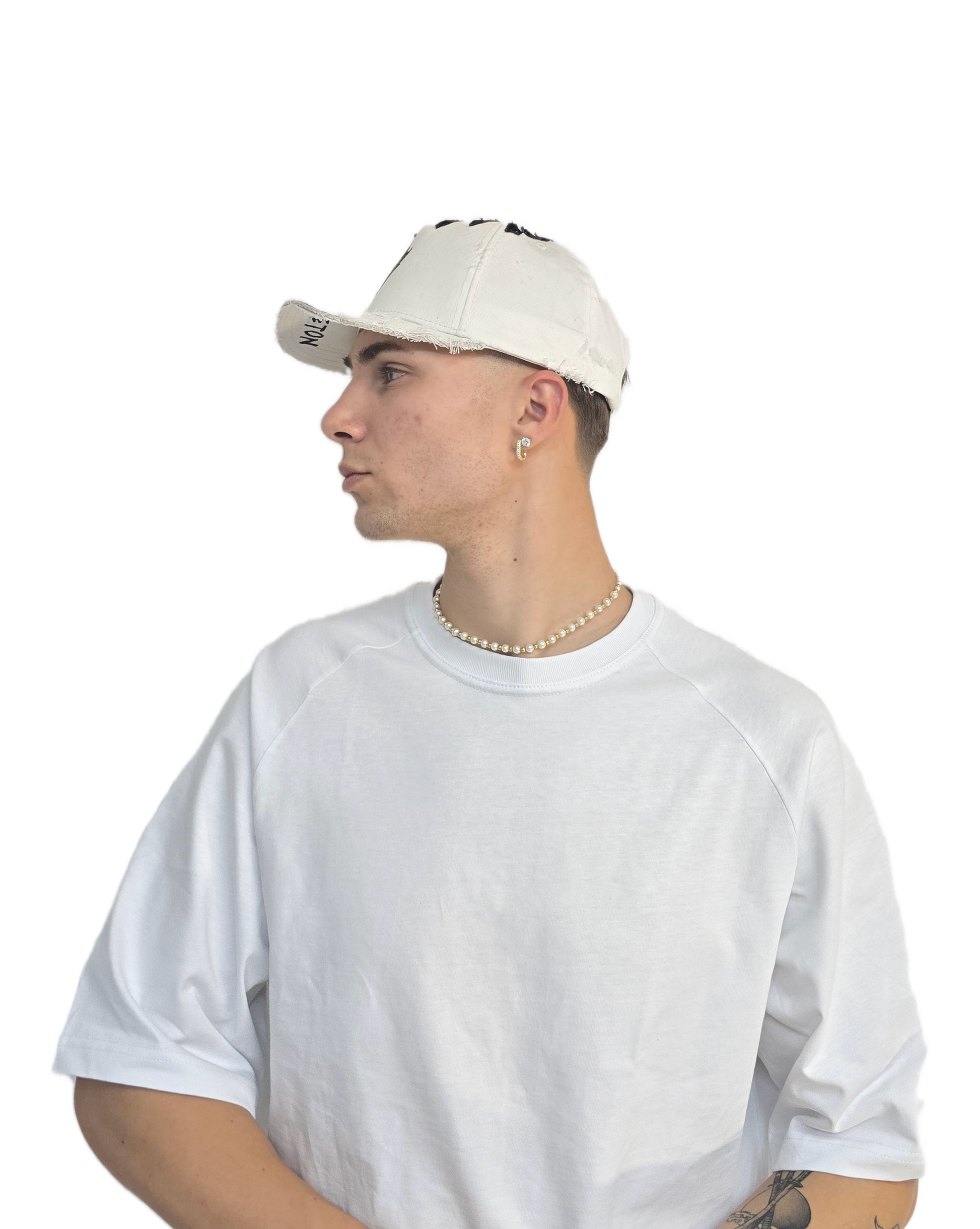 Cappellino customizzato a mano, presenta la visiera croppata, delle patch tagliate a cucite a mano che formano lo scheletro di una mano, infine sotto la visiera si trova la scritta "skeleton" pitturata a mano.