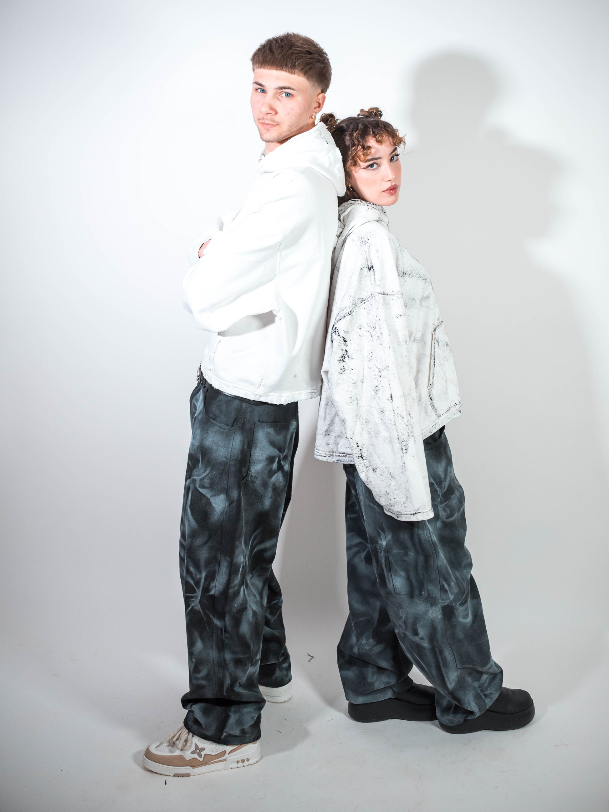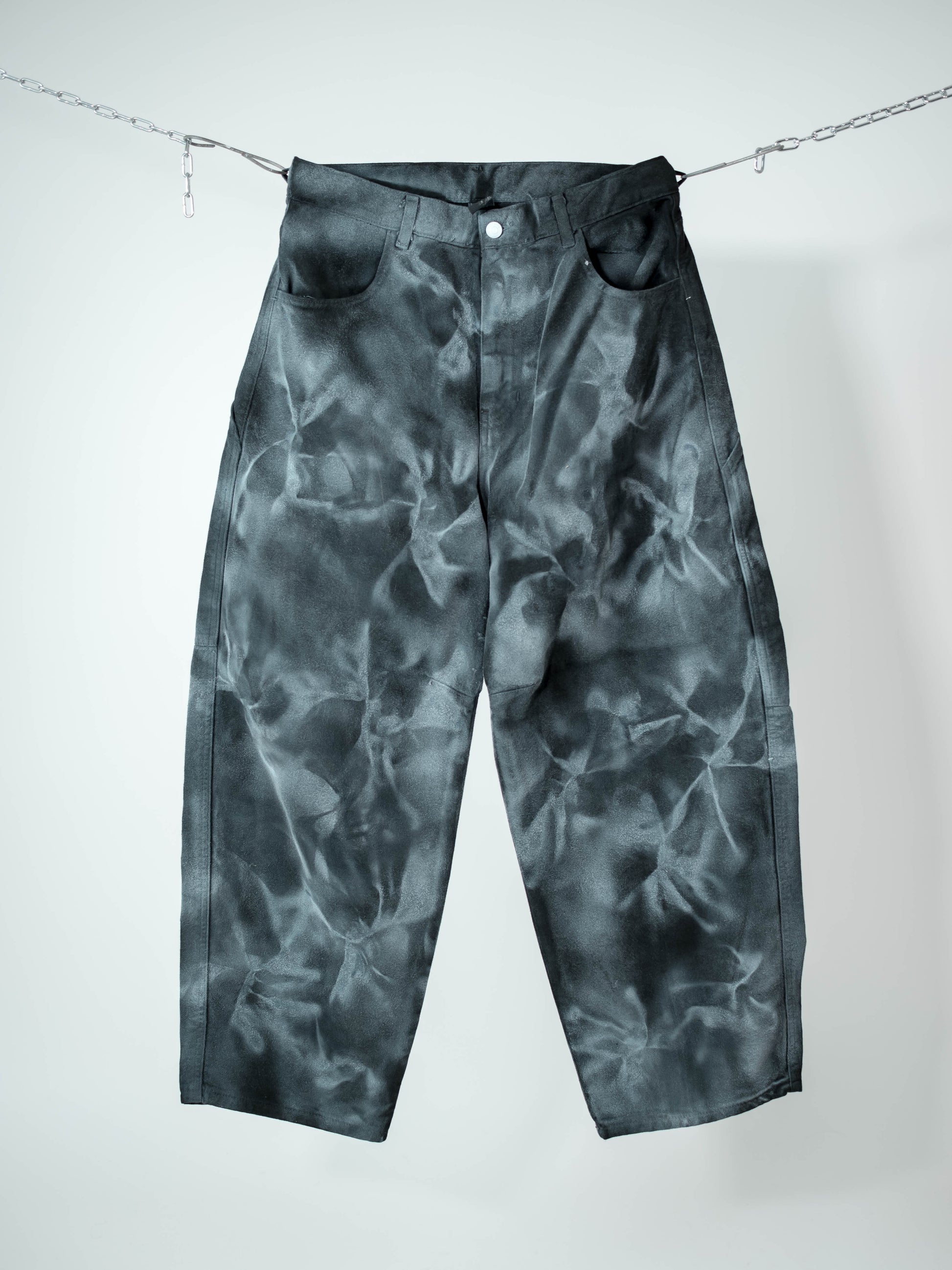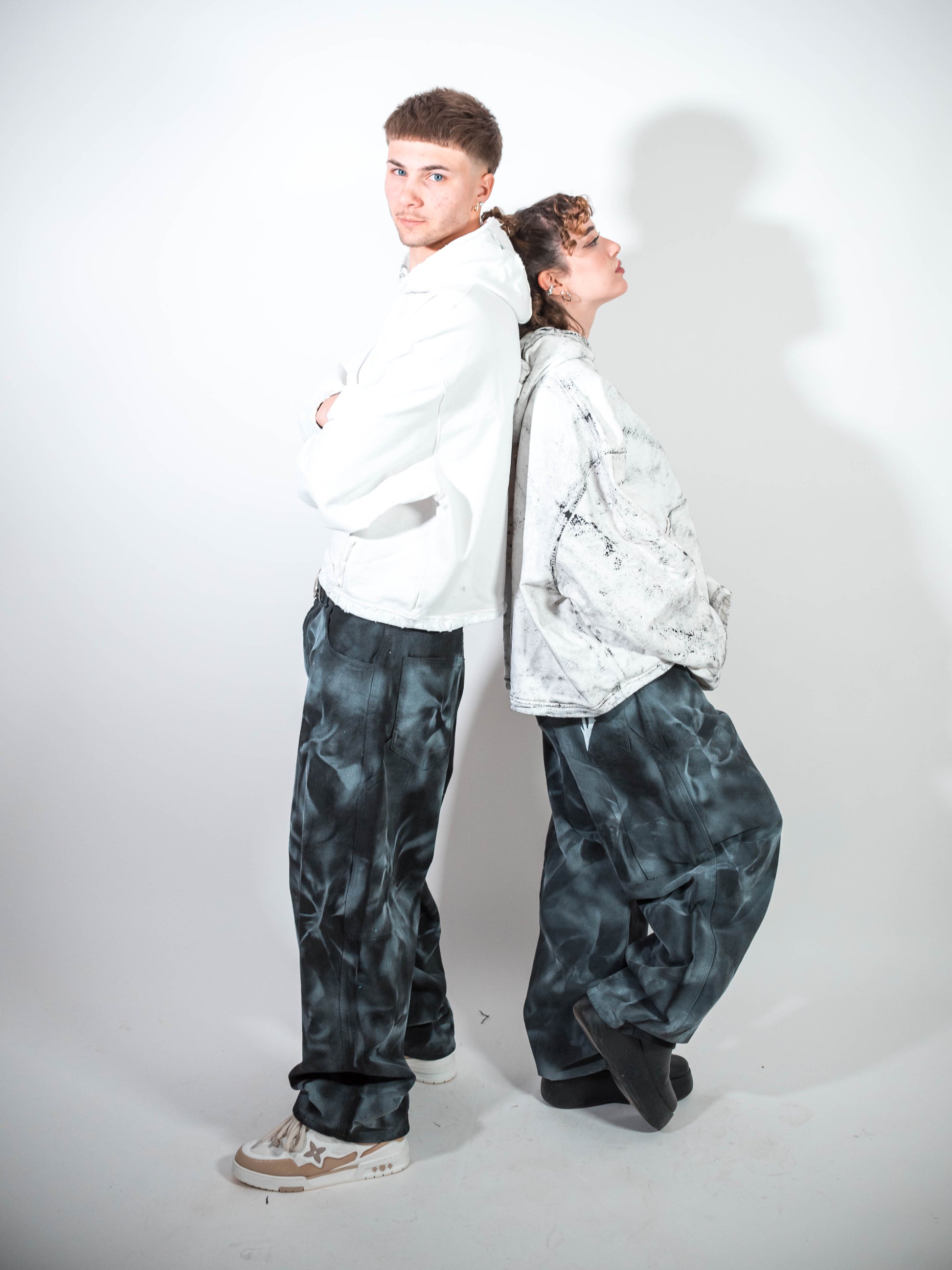 Pantalone in 100% cotone e made in italy, fit balloon con dettagli carpenter, presenta due tasche laterali e due riprese sul davanti per enfatizzare l'effetto balloon. Custom realizzata con colori appositi, ricreando un effetto "vortice" su tutto il pantalone.