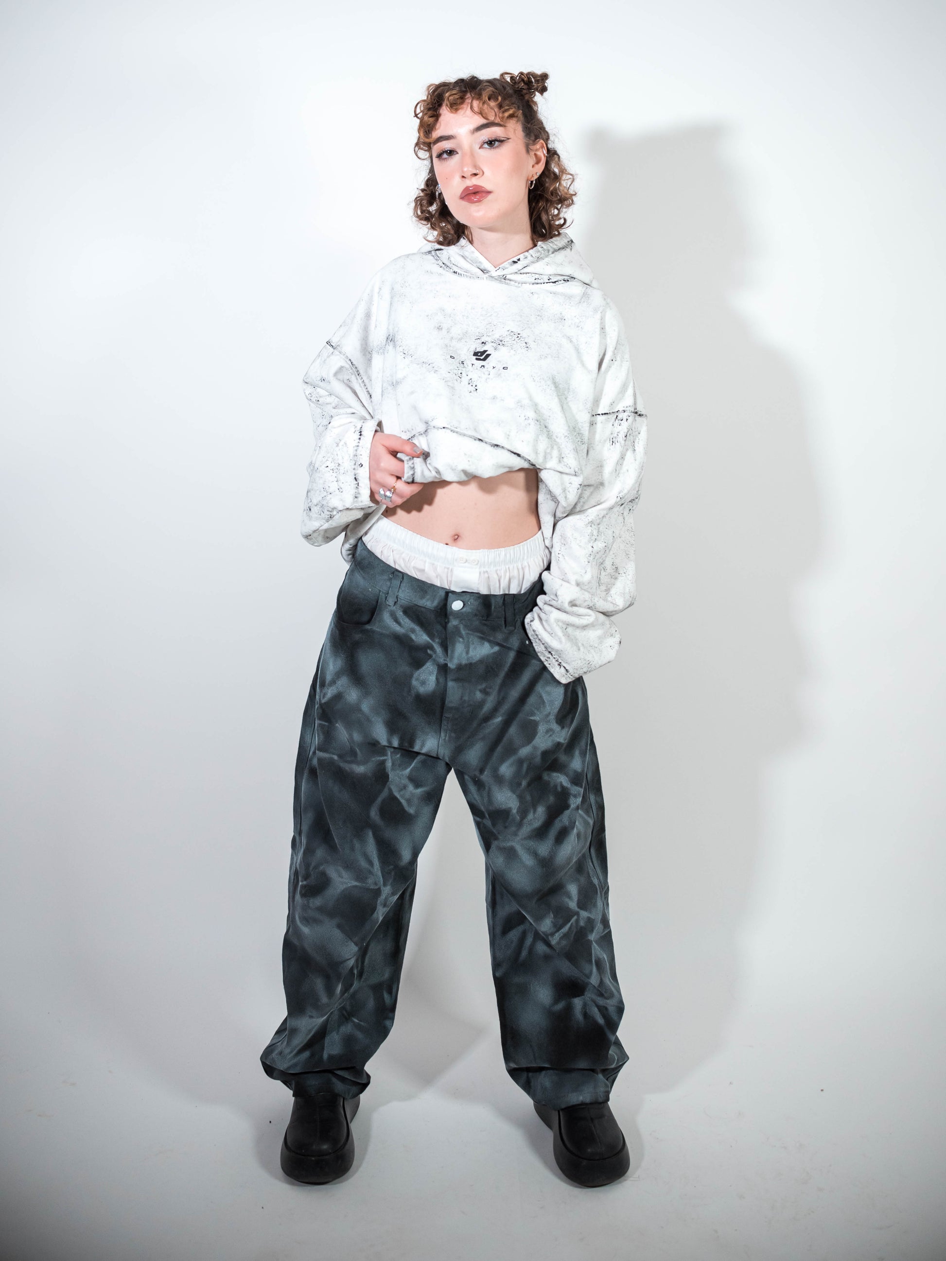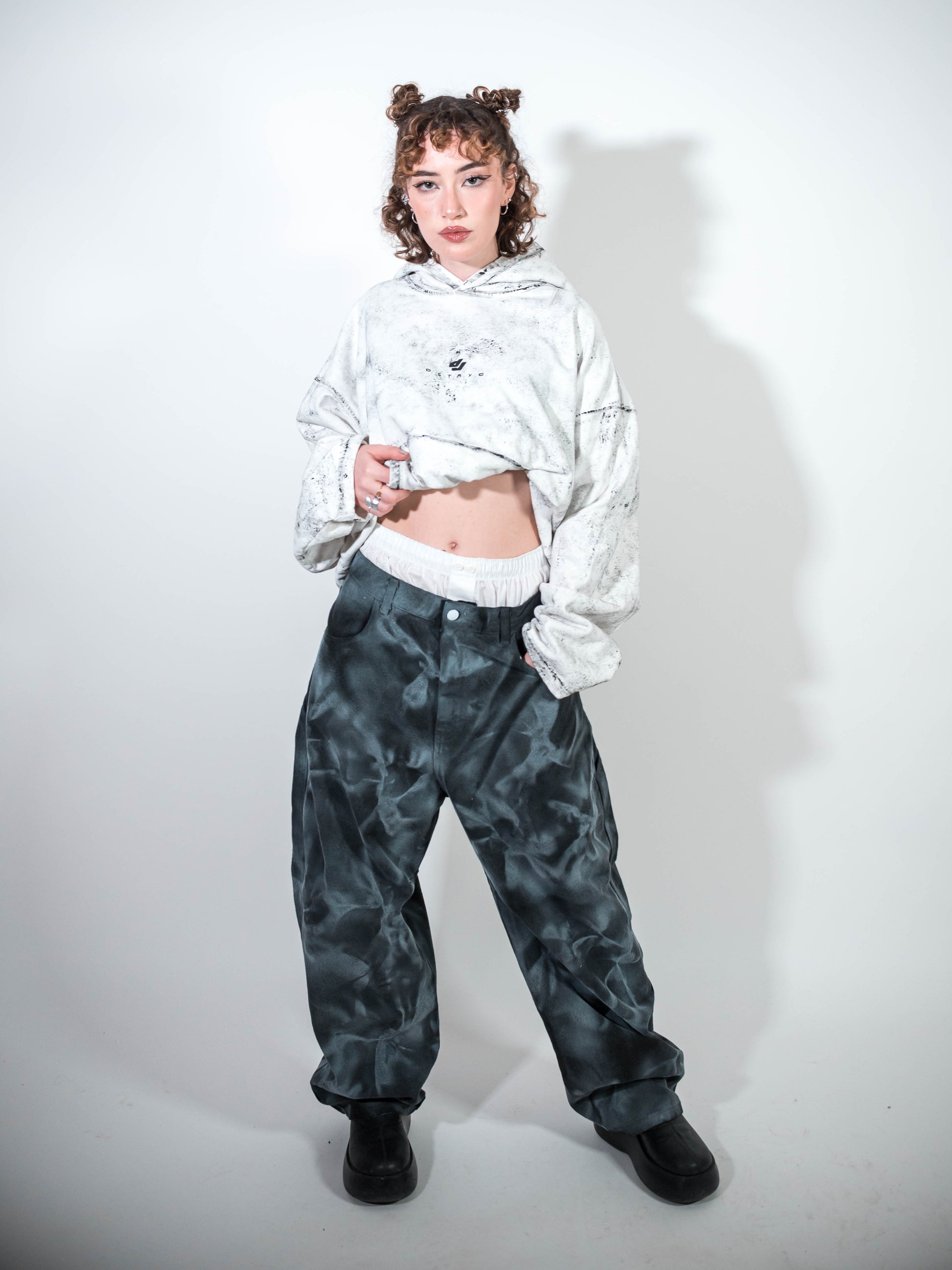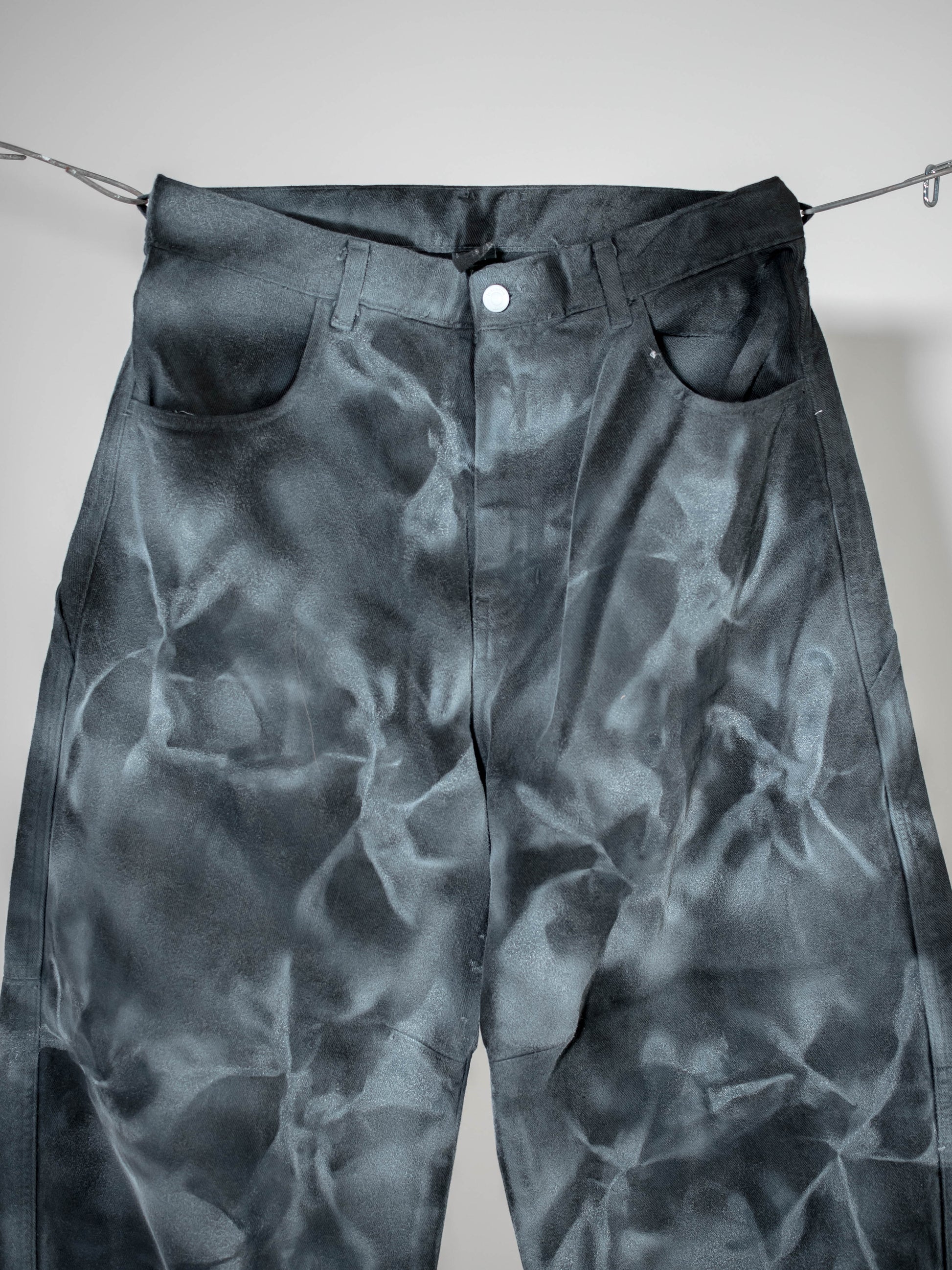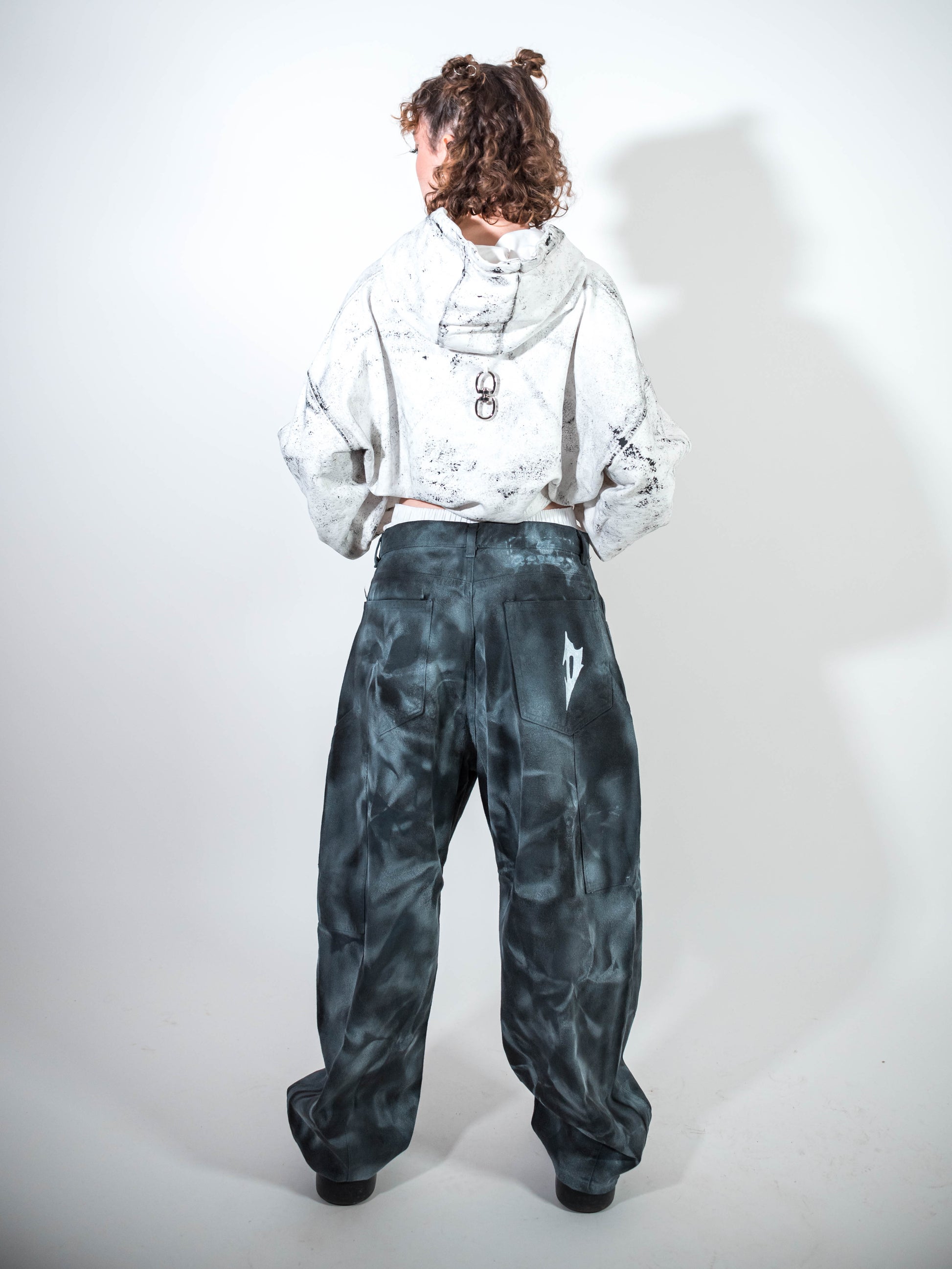 Pantalone in 100% cotone e made in italy, fit balloon con dettagli carpenter, presenta due tasche laterali e due riprese sul davanti per enfatizzare l'effetto balloon. Custom realizzata con colori appositi, ricreando un effetto "vortice" su tutto il pantalone.